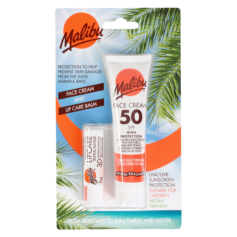 Malibu Blister Pack SPF 50 Face Cream 40ml & SPF 30 Lipbalm – Ultimate Sun Protection for Face & Lips – Hydrates and Prevents Sunburn