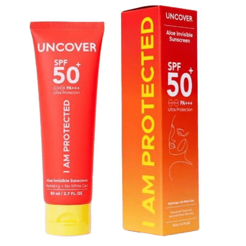 Uncover Aloe Invisible Sunscreen (80ml) is a powerful sunblock designed to provide broad-spectrum protection against harmful UV rays. Infused with Aloe Vera, this sunscreen soothes and hydrates the skin while offering SPF 50 protection, making it perfect for daily use and outdoor activities.